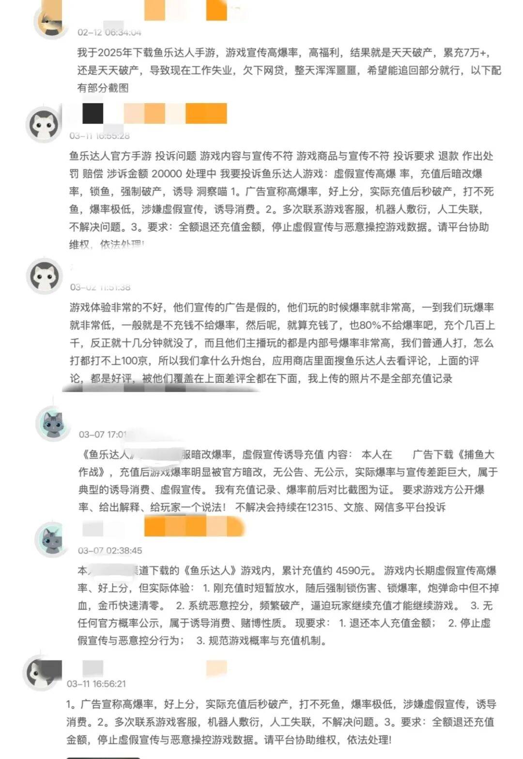 记者在各大消费投诉受理平台发现,涉及《鱼乐达人》及其运营方游酷盛世科技(北京)有限公司的同类投诉达数百条。许多投诉内容与计先生的遭遇高度相似,涉及金额从几千元到十几万元不等,该游戏被指“虚假宣传、爆率名不副实、诱导充值”等。有玩家称其在3年内累计充值近6万元,游戏会短暂提高爆率给予少量奖励,随后立即大幅降低爆率,导致金币快速耗尽,形成“充值—金币快速清零—再充值”的循环。还有玩家投诉称,每次充值后没多久就会“破产”。更有家长投诉,孩子使用成人实名信息在该游戏内累计充值12万余元,要求退款时,被游戏公司以“道具已使用”为由拒绝。